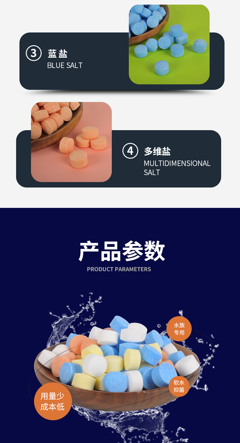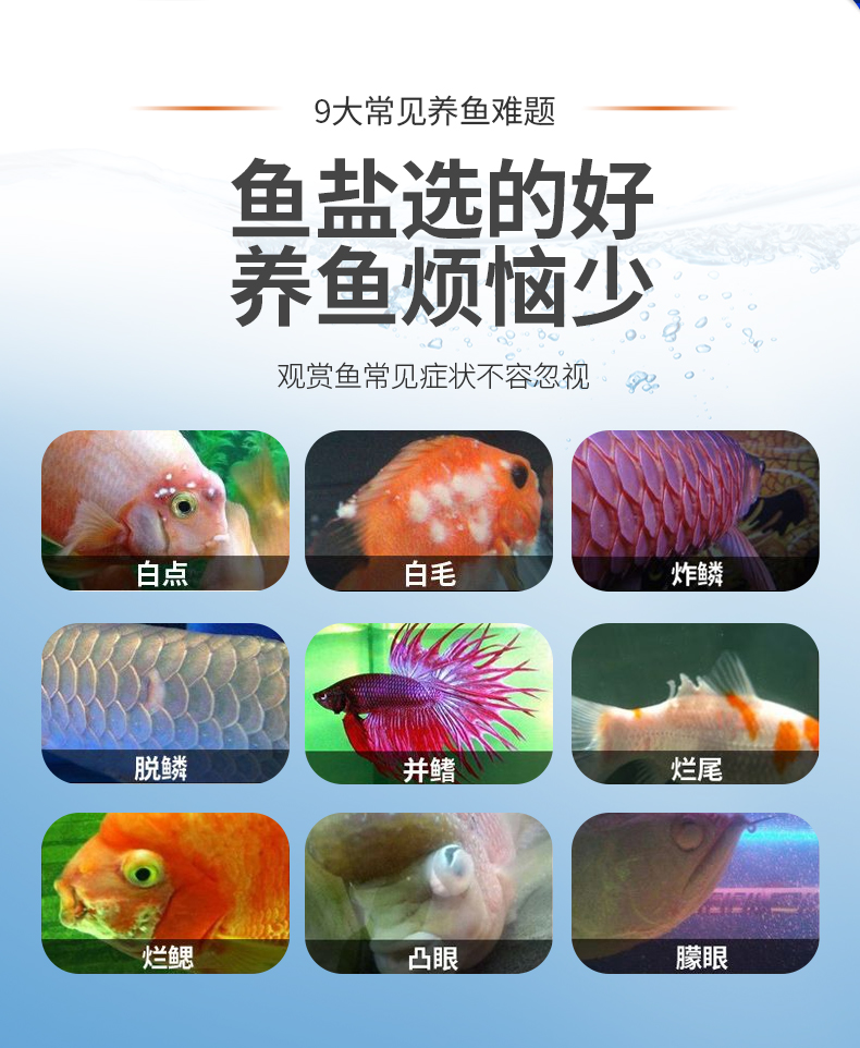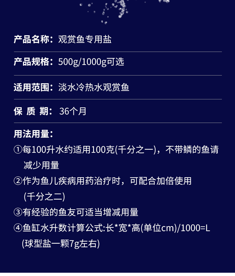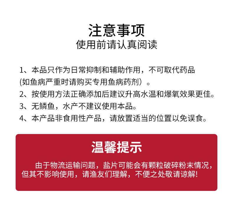 ①每100升水約適用100克(千分之一),不帶鱗的魚請減少用量